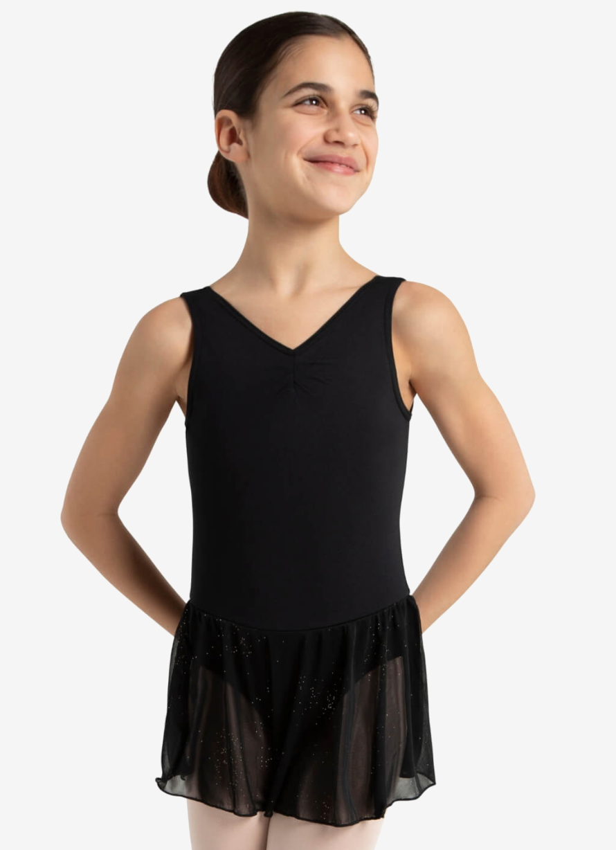 Create timeless silhouettes in the Pinch Front Tank Dress. Made from a soft cotton and spandex blend, this dress is designed to provide comfort and flexibility for all types of movement. Featuring a full front lining to ensure modesty during every class and performance. The V-front neck and scoop back create a flattering and feminine silhouette, while the single-layer attached skirt adds an extra touch of elegance. The skirt is made from 100% polyester, which gives it a lightweight and flowing feel. The ballet leg line of the dress helps to elongate the legs and create a graceful appearance. Available in child sizes only.